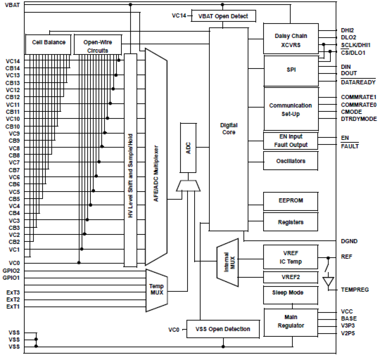 - 多达 14 节电池电压监控器,支持锂离子 CoO2、锂离子 Mn2O4 和锂离子 FePO4 化学材料