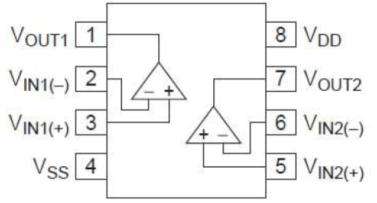 - 宽输出电压范围:VOUT:VSS+0.1V 至 VDD-0.1V(Io = 5mA 时)
