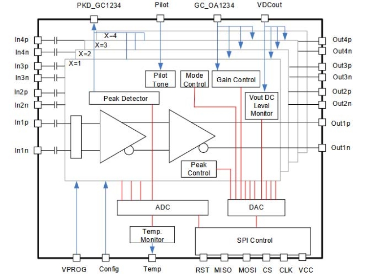 The RG8G71474 integrates analog control and digital (through an SPI interface) control circuitry for precise, independent driving level control and monitoring. Each driver channel has a 100Ω differential AC-coupled input and 60Ω differential interface with an open-collector type output stage and is suitable for InP-based and silicon photonics-based Mach-Zehnder modulators.