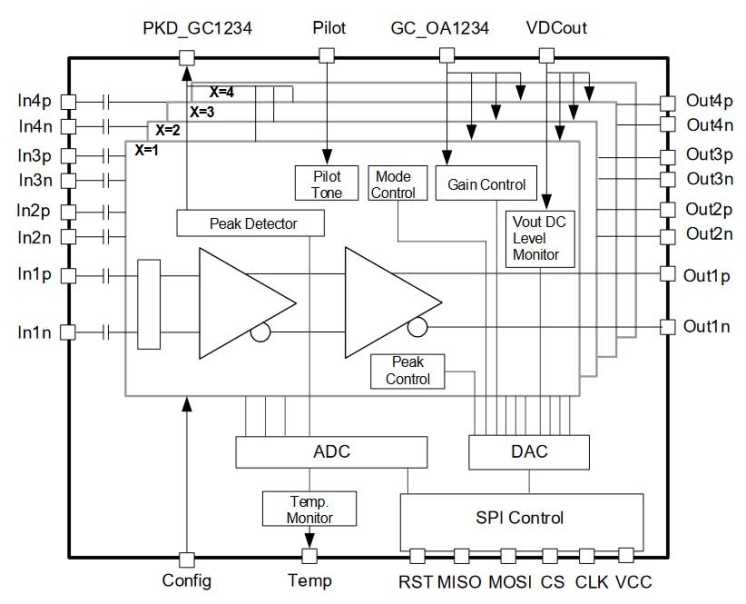 The RG8G7147A integrates analog control and digital (through an SPI interface) control circuitry for precise, independent driving level control and monitoring. Each driver channel has a 100Ω differential AC-coupled input and 60Ω differential interface with an open-collector type output stage, suitable for InP-based and silicon photonics-based Mach-Zehnder modulators.