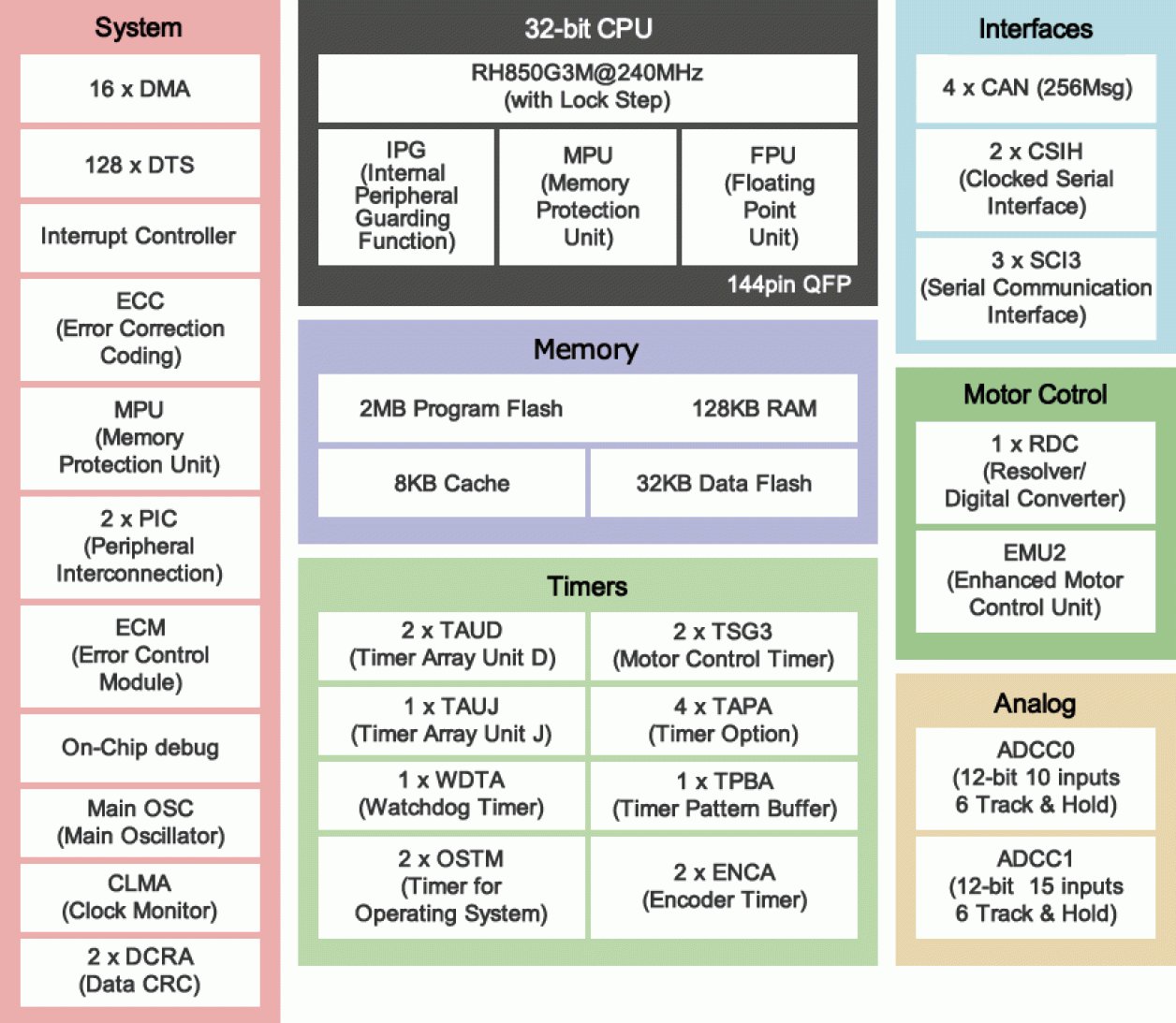 The RH850/C1M with internal Resolver/Digital Converter (RDC2) and motor control unit (EMU2) reduces CPU load and can control motors with very little CPU interaction.