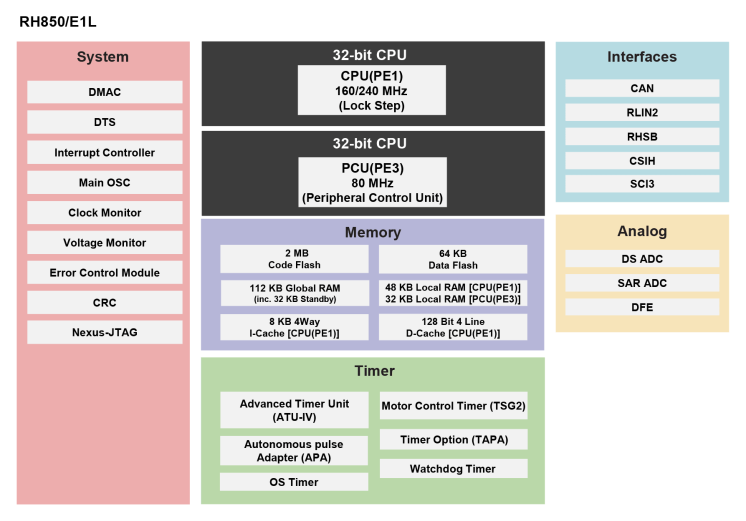 The RH850/E1L Safe and secure high-end microcontroller for powertrain (function-reduced version of RH850/E1M-S) with many built-in functions for realizing functional safety (ISO 26262). It is a function-reduced version of the RH850/E1M-S. The RH850/E1L microcontroller has a maximum operating frequency of 240MHz. With two A/D converters (SAR and delta-sigma), a digital filter engine, an advanced timer unit (ATU-IV), and more, this MCU realizes high-precision complex powertrain control. Many functions for realizing functional safety (ISO 26262) are built in, helping to simplify the certification process.