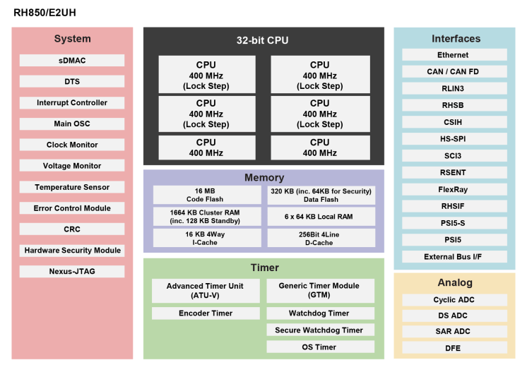 The RH850/E2UH microcontrollers operate at 400 MHz and are equipped with large-capacity code flash and RAM of the highest speed class, which is necessary for real-time control. By leveraging multiple G4MH cores, the RH850/E2M supports even more advanced functionality, and many built-in functions such as security functions for Evita Medium and functional safety (ISO 26262) functions make it easier to get the certification. Over The Air (OTA) updating for automatically updating software wirelessly to a safer control program is also supported.