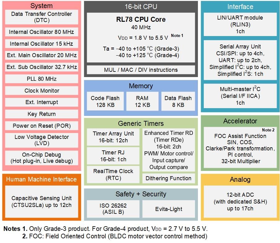 RL78/F2x 系列产品按 ISO 26262 标准设计而成,最高支持 ASIL B 的功能安全 (FuSa) 等级。 可支持 EVITA-Light 或更高的安全标准。 AES 加密模块可处理高达 256 位的密钥长度,并支持安全启动和身份验证功能。 为了进一步提高 BLDC FOC(磁场导向控制)电机控制和 DC/DC 控制系统的计算性能,RL78/F2x 配备了独特的应用加速器 IP,以减轻复杂的三角函数和其它计算处理所带来的负荷。 RL78/F22 配备了电容式触摸传感单元 (CTSU2SLa)。