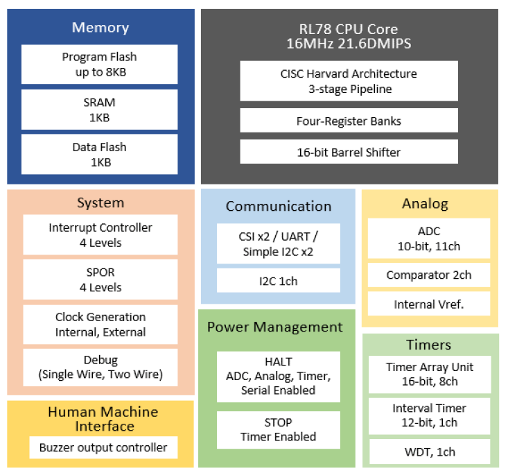RL78/G15是一种通用微控制器,工作频率为16MHz。包括RL78系列最小的8引脚封装在内,我们提供丰富的产品阵容,适用于-40℃-125℃的各种工作环境温度。产品内置高精度(±1.0%)高速片上振荡器、数据闪存和丰富的串行接口和比较器,因此适合需要节省空间的小型应用场景。RL78/G15包括丰富的开发环境,只需连接USB线缆, 即可编写和调试评估板(Fast Prototyping Board)、可通过GUI简化软件设计的Smart Configurator和Arduino库等。它与现有的RL78系列兼容,适用于家电、消费类电子产品到工业设备的广泛用途。