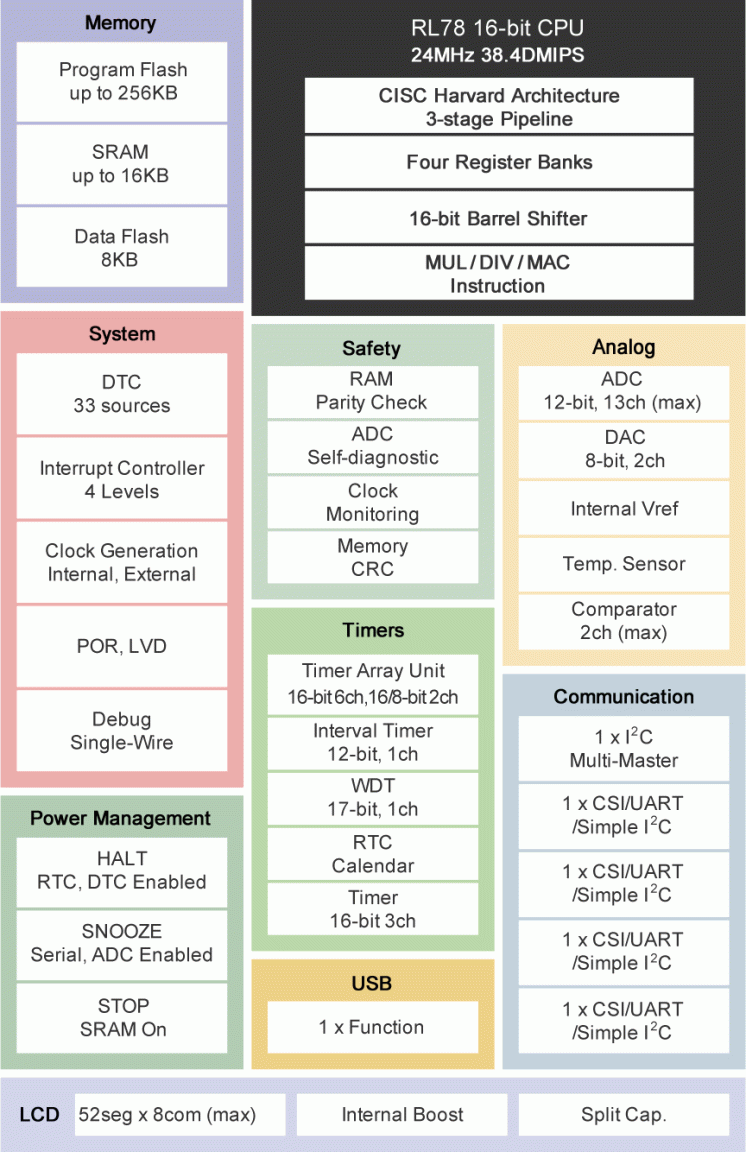 RL78/L1C microcontrollers have a built-in segment LCD driver and USB 2.0 function. Three LCD driving voltage generation methods (external resistance division, capacitive split, and internal voltage boost) are supported, corresponding to a variety of segment LCD panels. They realize low current consumptionNote 1: external resistance division: 1.76μANote 2, internal voltage boost: 1.23μA, and capacitive split: 0.74µA. They support USB high-speed battery charging (Battery Charging Specification 1.2) and come in a lineup of 80/100-pin, maximum 416 segment products. These microcontrollers can be used in sensor modules and healthcare devices as well as home appliances and measurement devices.