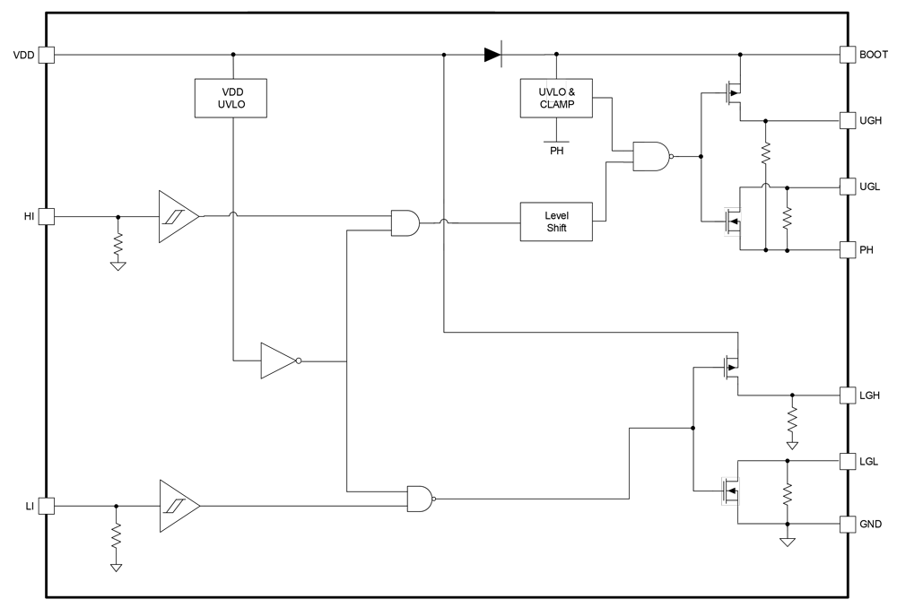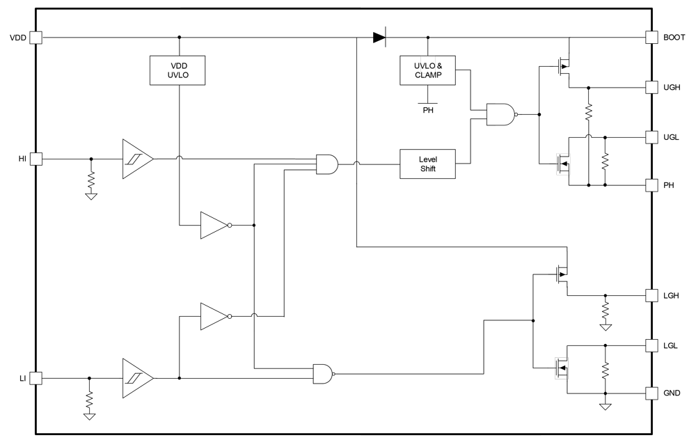 • 独立的高侧和低侧 TTL 逻辑输入,最高耐受 14V 电压,与 VDD 电压无关