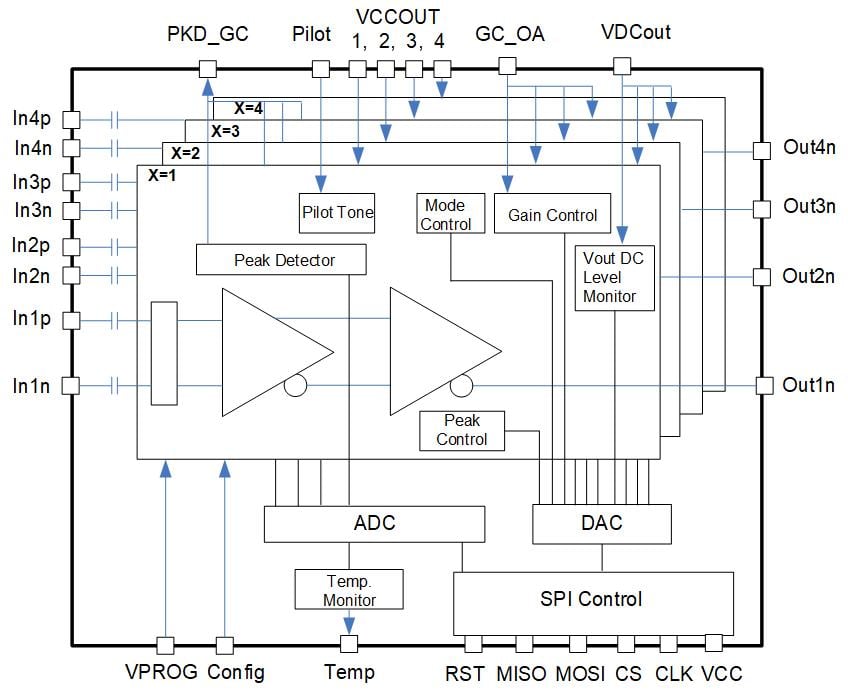 该器件在单个芯片上集成了四通道驱动电路以及用于直流控制和监控的串行外设接口(SPI)电路。 每个驱动通道均具备 100Ω 差分交流耦合输入,以及带后端匹配输出级的单端输出。 该输出级支持与特性阻抗在 30Ω~50Ω 宽范围的光调制器实现外部交流耦合接口。 2.0Vpps 的线性输出电压适用于采用多电平 QAM 调制的铌酸锂(LiNbO3)光调制器。