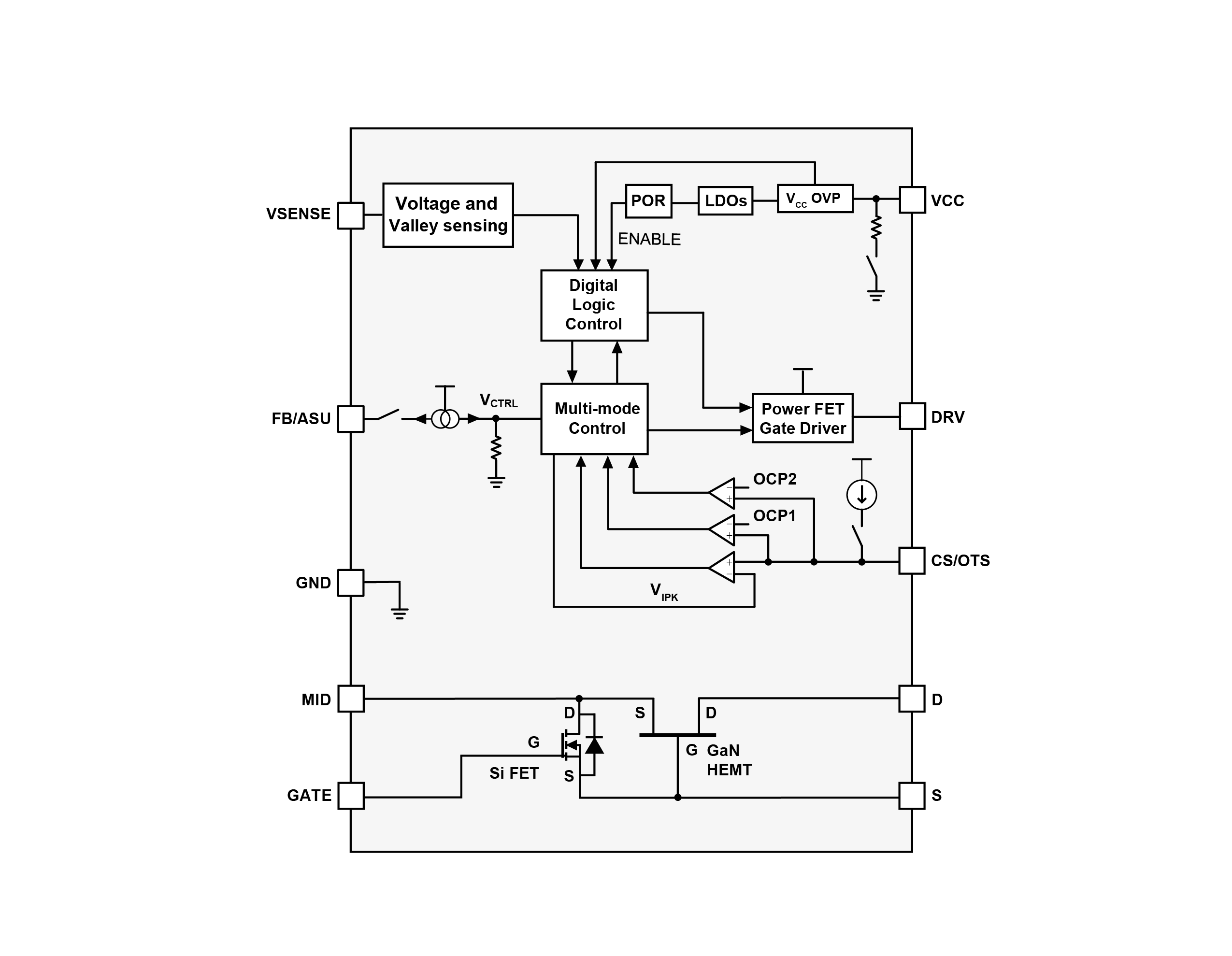 该器件工作于恒频准谐振(QR)模式,并采用自适应多模式控制(MMC)技术,涵盖脉宽调制(PWM)、脉冲频率调制(PFM)以及突发模式(Burst Mode)等多种工作模式。 这种控制方法能够在各种负载条件下有效提升效率、降低电磁干扰(EMI),并消除音频噪声。