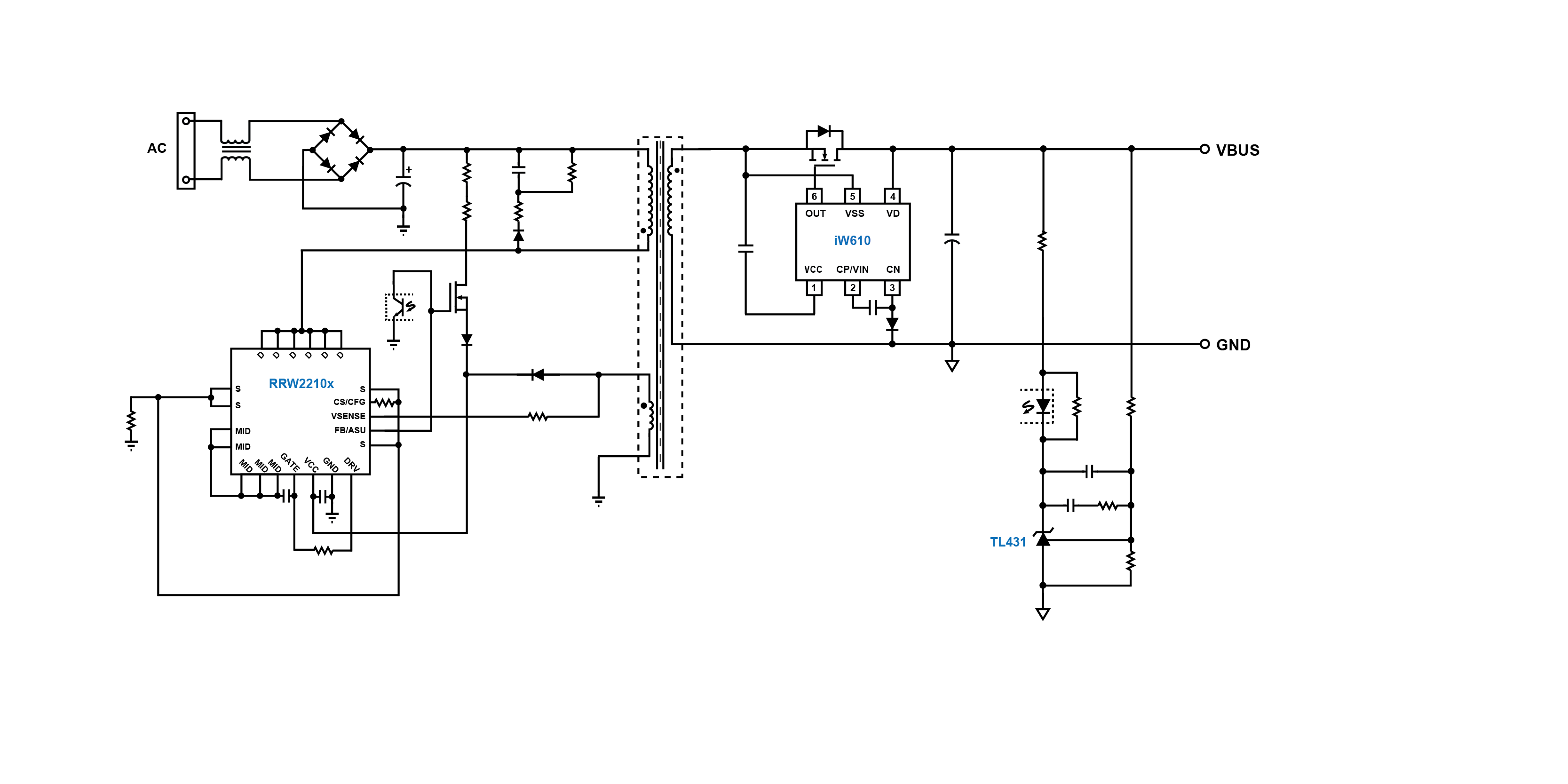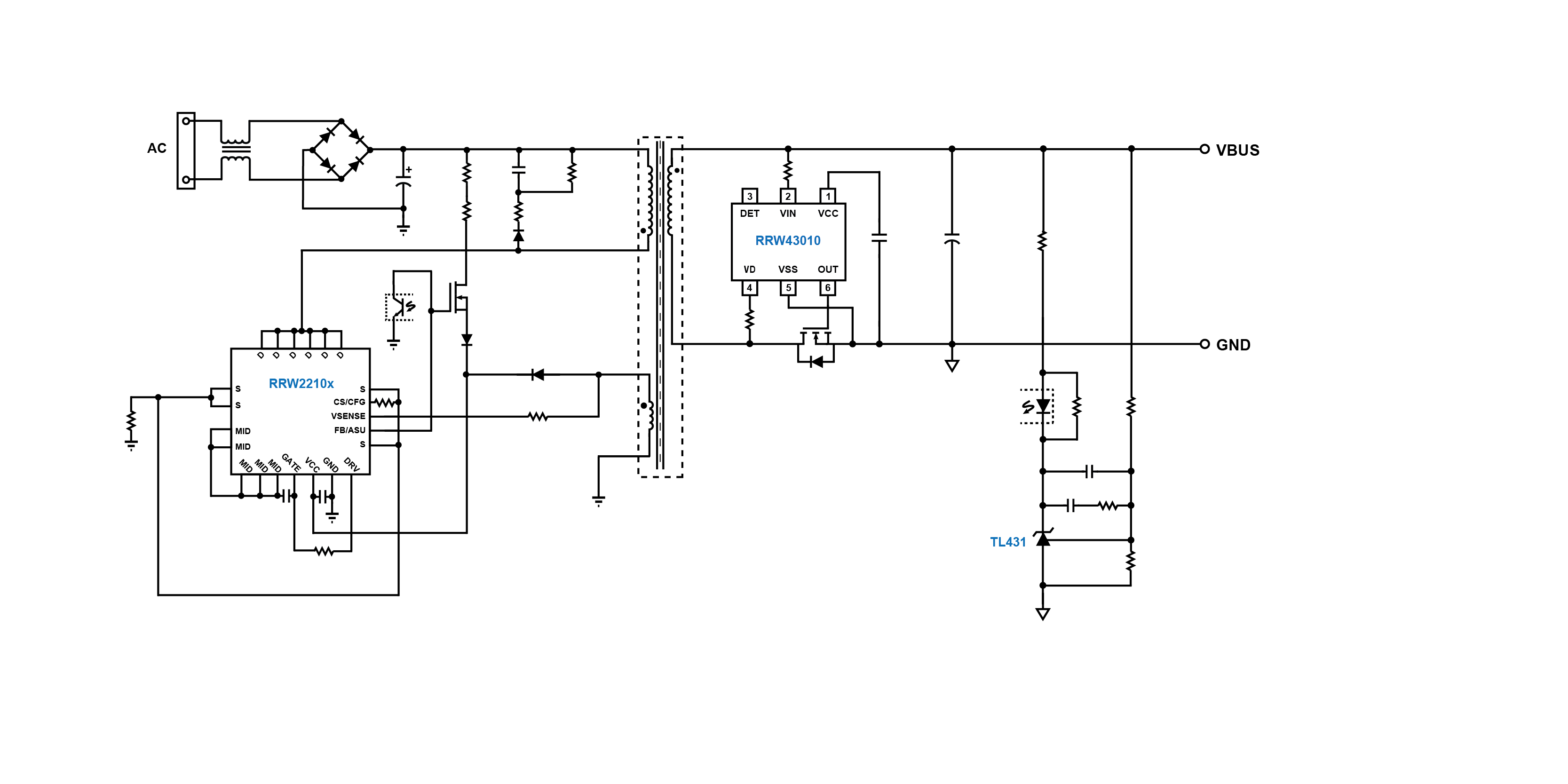 搭配 TL431 或其他次级侧控制器使用时,RRW22101 在典型大功率设计中能够实现精准恒压(CV)、快速动态负载响应,并将待机功耗控制在 75mW 以下。 其集成的保护功能以及对双极性辅助绕组检测的支持,不仅简化了变压器设计,提升了 EMI 性能,还有助于降低整体系统成本。