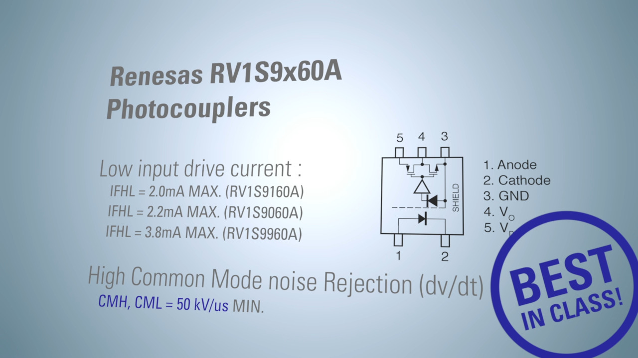 Renesas' RV1S9x60A photocouplers achieve high speed, low power consumption and high noise rejection, and are ideal for the development of high performance and high reliability automation equipment and green energy systems.