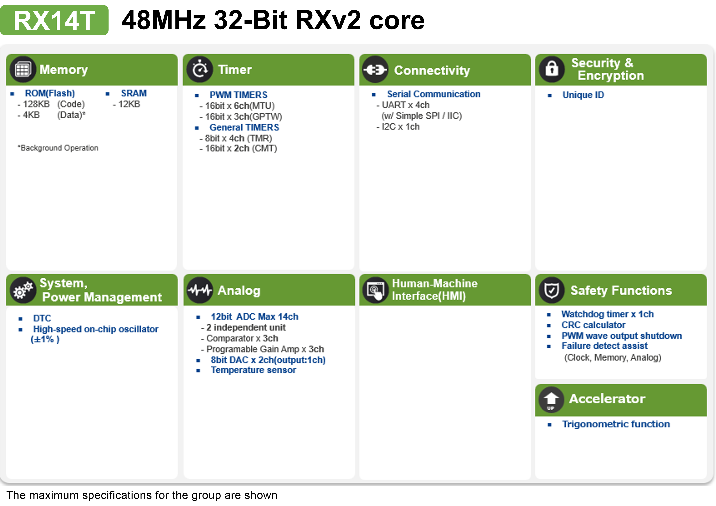 - 48MHz RXv2 内核(5.05 CoreMark/MHz),单精度 FPU