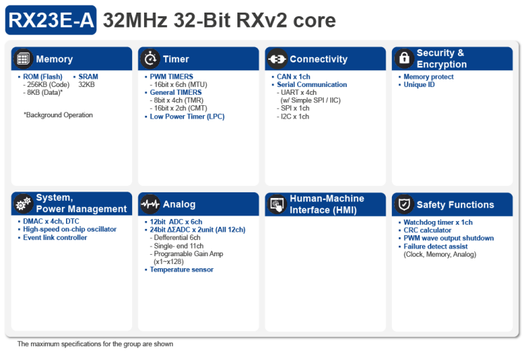 RX23E-A 系列微控制器配备模拟前端,无需校准即可测量温度、压力、流量和重量,精度优于 0.1%,是高精度传感、测试和测量设备的理想之选。CPU 配备 RXv2 内核,在 DSP/FPU 运行中表现卓越,可以单芯片实现高精度测量、控制和通信。