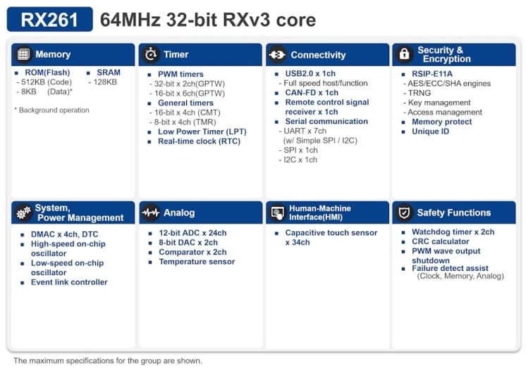 RX261 产品群是具有出色的能效比的 32 位微控制器、提供先进触摸功能和强大的安全特性。 适用于消费类电子、工业自动化、建筑自动化以及电池供电产品等多种应用。