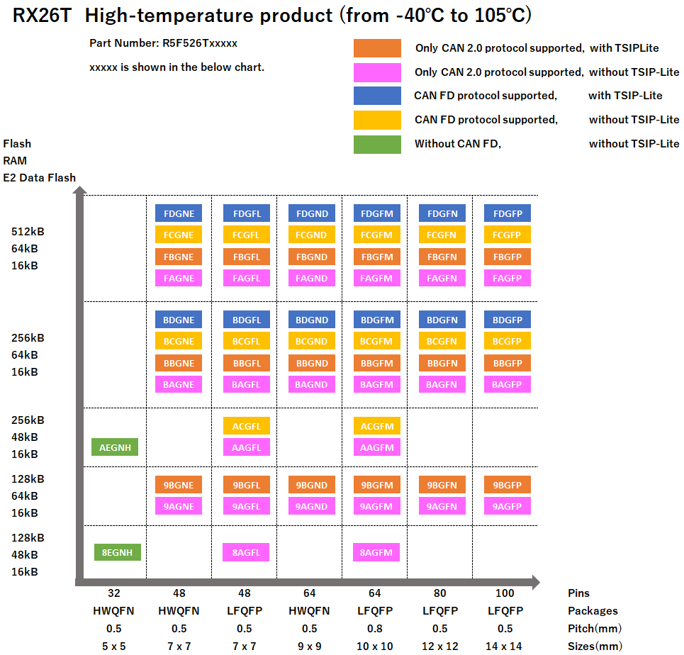 | Security & Encryption | Unique ID, Unique ID, AES, MAC, TRNG, Unique ID, TSIP-Lite:AES(128/256), TSIP-Lite:CMAC, TSIP-Lite:TRNG, TSIP |