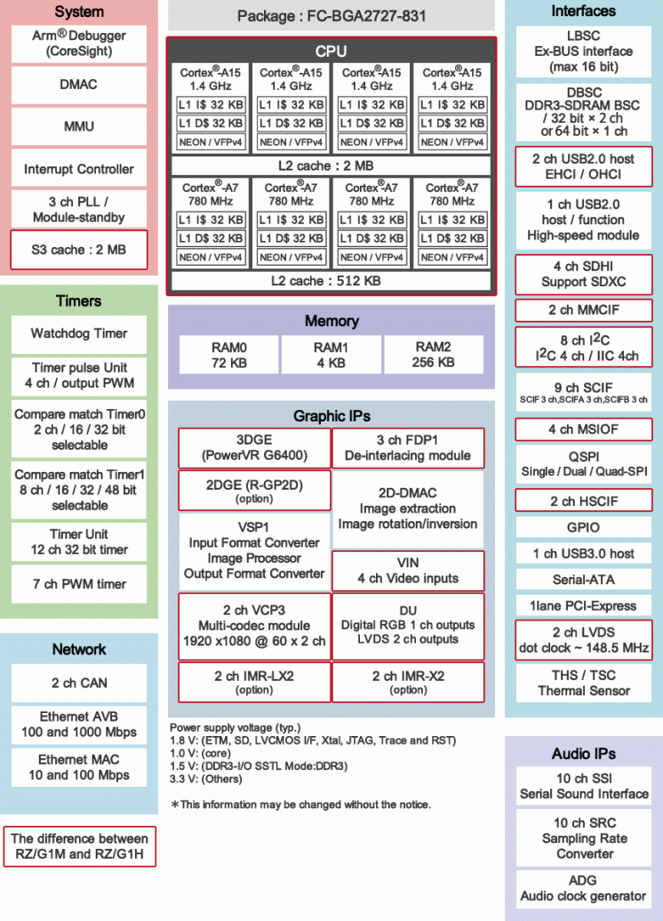 The RZ/G1H is Renesas' top-class performance device for general-purpose applications. It is equipped with a quad-core Cortex®-A15 (1.4GHz) and Cortex®-A7 (780MHz) CPU, a DDR interface with two channels of 32-bit DDR3 bus, a 3D graphics engine (PowerVR G6400) as a dedicated hardware engine, and two dedicated channels of hardware supporting encoding and decoding of full high-definition video. This high-spec processor is also equipped with high-speed USB 3.0, PCI Express, and SATA interfaces and other comprehensive peripheral functions. The high performance of the RZ/G1H allows it to carry out image processing that requires high processing capabilities, such as image recognition and authentication, and multiple video processing.