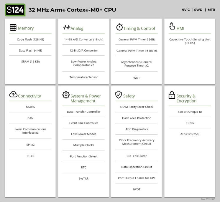 S124 单片机系列具有128KB闪存及16KB SRAM,专为简单电池供电传感应用量身定制,使其具备低功耗工作模式及快速唤醒时间。除安全保障功能外,S124系列还配备14位A/D转换器、12位D/A转换器及电容式触摸感应元件。