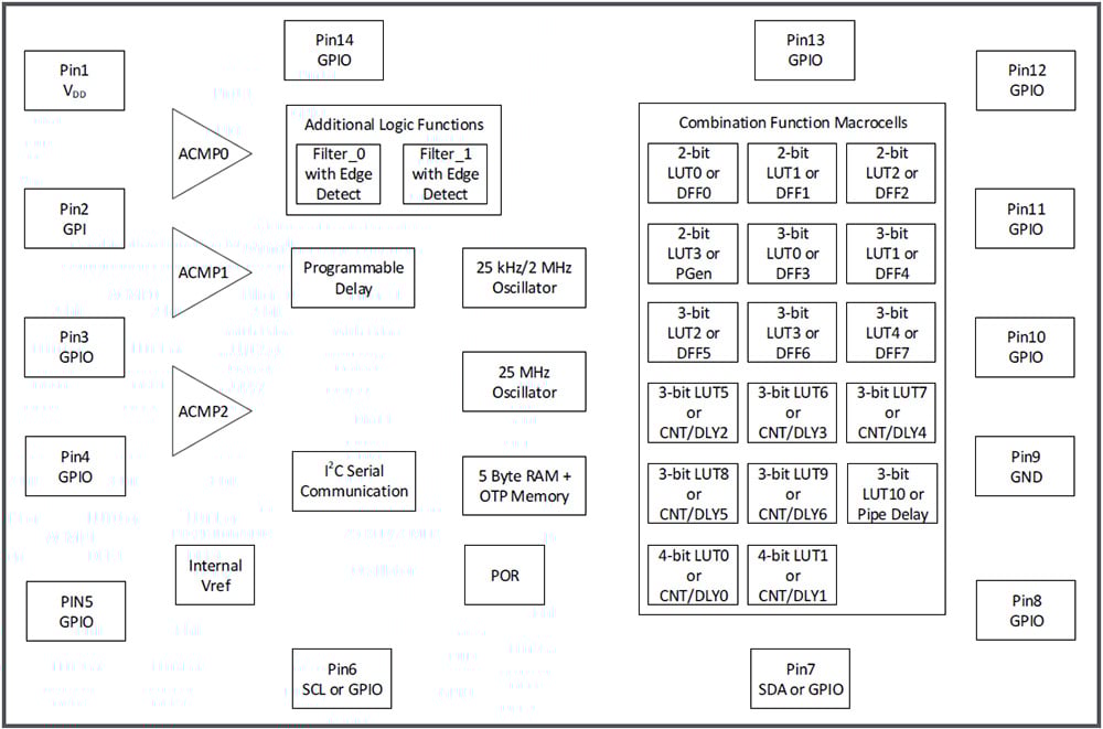 - 5 个 8 位延迟/计数器(8-bit CNT/DLY)或 3-bit LUT