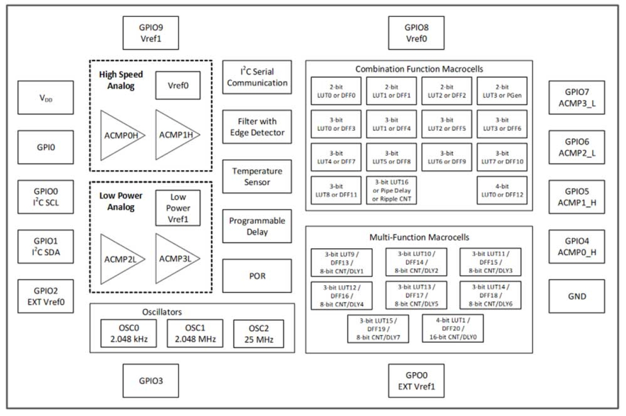 - 7 个可选 DFF/LATCH 或 3 位 LUT + 8 位延迟/计数器