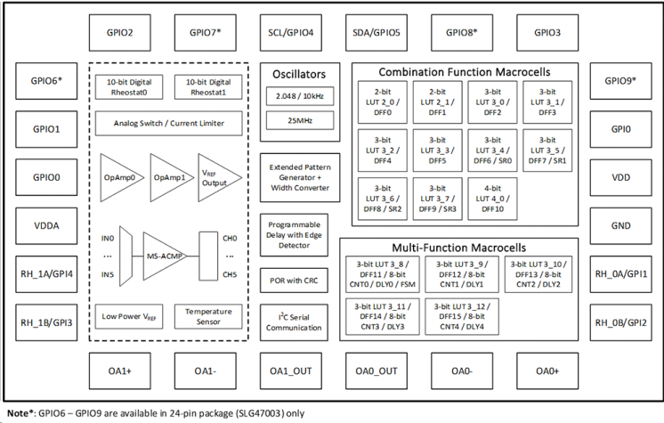 The SLG47001 and SLG47003 are compact, low-power, low-cost programmable mixed-signal matrix ICs with analog features. These devices are part of the AnalogPAK™ sub-family.