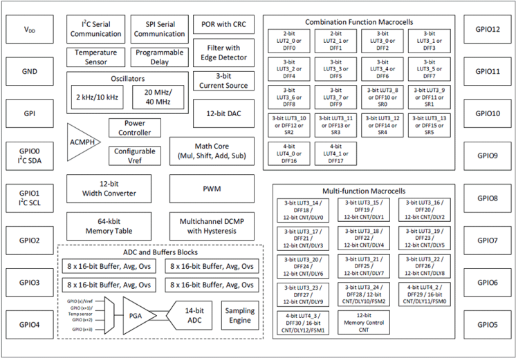 | Special Features | ADC (14-bit, SAR), DAC (12-bit), PGA, 1x-64x, MathCore, 4k x 12-bit RAM, PWM |