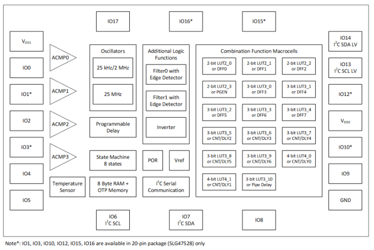 SLG47528 GreenPAK™ 可编程混合信号矩阵为常用的混合信号功能提供了一个小型、低功耗组件。 用户通过对一次性可编程 (OTP) 非易失性存储器 (NVM) 进行编程来配置互连逻辑、IO 引脚和SLG47528的宏单元,从而创建电路设计。 这种高度通用的器件允许在非常细小而低功耗的单个集成电路中设计各种混合信号功能。
