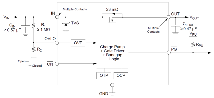 - Resistor-adjustable VIN Overvoltage Lockout [or fixed 6.5V default (OVLO = GND)]