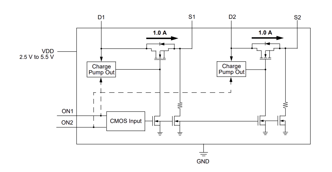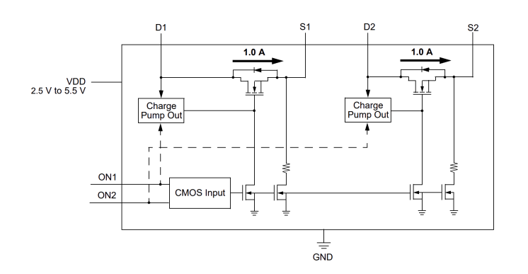 The SLG59M1512V GreenFET dual N-channel load switch is designed for power switching applications. The device comes with two 80mΩ 1.0A rated MOSFETs, each controlled by an ON control pin. The ramp rate of each MOSFET is adjustable depending on the input current level of the ON pin. The product is packaged in an ultra‑small 1.6mm x 1.0mm package.