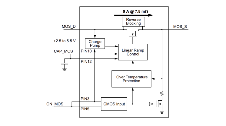 The SLG59M1600V single N-channel reverse blocking load switch is designed for power switching applications. The part comes with one 9A-rated MOSFET switched on by an ON control pin. The MOSFET turn-on time is adjusted by an external capacitor.
