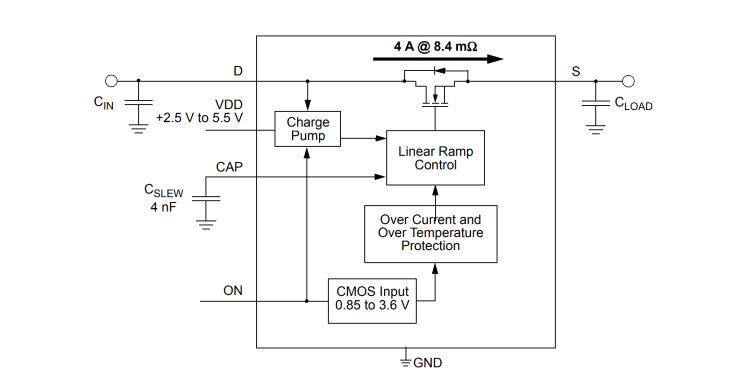 The SLG59M1657V is a high‑performance 8.4mΩ, 4A single‑channel nFET load switch that can operate with a 2.5V to 5.5V VDD supply to switch power rails from as low as 0.9V up to the supply voltage. The SLG59M1657V incorporates two-level overload current protection, thermal shutdown protection, and inrush current control which can easily be adjusted by a small external capacitor. Using a proprietary MOSFET design, the SLG59M1657V achieves a stable 8.4mΩ RDSON across a wide input voltage range. In addition, the SLG59M1657V’s package also exhibits low thermal resistance for high-current operation. Fully specified over the -40 °C to 125 °C temperature range, the SLG59M1657V is packaged in a space‑efficient, low thermal resistance, RoHS‑compliant 1.5mm x 2.0mm STDFN package.
