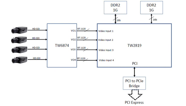 The TW2819 is a high performance and cost effective multi-channel H. 264 CODEC solution designed for the security surveillance market. It is capable of receiving and encoding maximum 16 channels standard definition (SD) or 960H (WD1) video. It can also support up to 8-channel high definition (HD) 720p or 4-channel 1080p encode. It supports D1/960H/720p/1080p decode also up to 4 channels. Each video channel can be independently controlled in terms of encode/decode mode, frame rate, bit rate.