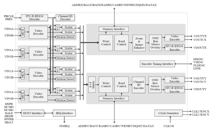 The TW2834 has four high quality NTSC/PAL video decoders, dual color display controllers and dual video encoders. The TW2834 contains four built-in analog anti-aliasing filters, four 10-bit Analog-to-Digital converters, proprietary digital gain/clamp controller, high quality Y/C separator to reduce cross-noise and high performance dual scaler. Four built-in motion and blind detectors can increase the feature of a security system. The TW2834 has a flexible video display controller including basic QUAD and MUX functions. The TW2834 also has excellent graphic overlay function that displays character/bitmap for OSD, single box, 2D array box, and mouse pointer. The built-in channel ID CODEC allows auto decoding and displaying during playback and the additional scaler on the playback supports multi-cropping function of the same field or frame image. The TW2834 contains two video encoders with four 10-bit Digital-to-Analog converters for providing 2 composite or S-video outputs. The TW2834 also can be extended up to 8/16 channel video controller using chip-to-chip cascade connection.