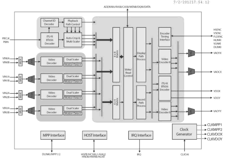 The TW2836 has four high quality NTSC/PAL video decoders, dual color display controllers and dual video encoders. The TW2836 contains four built-in analog anti-aliasing filters, four 10bit Analog-to-Digital converters, and proprietary digital gain/clamp controller, high quality Y/C separator to reduce cross-noise and high performance free scaler. Four built-in motion, blind and night detectors can increase the feature of security system. The TW2836 has flexible video display/record/playback controller including basic display and MUX functions. The TW2836 also has excellent graphic overlay function that displays bitmap for OSD, single box, 2D array box, and mouse pointer. The built-in channel ID CODEC allows auto decoding and displaying during playback and the additional scaler on the playback supports multi-cropping function of the same field or frame image. The TW2836 contains two video encoders with three 10bit Digital-to-Analog converters to provide 2 composite or S-video. The TW2836 can be extended up to 8/16 channel video controller using chip-to-chip cascade connection.