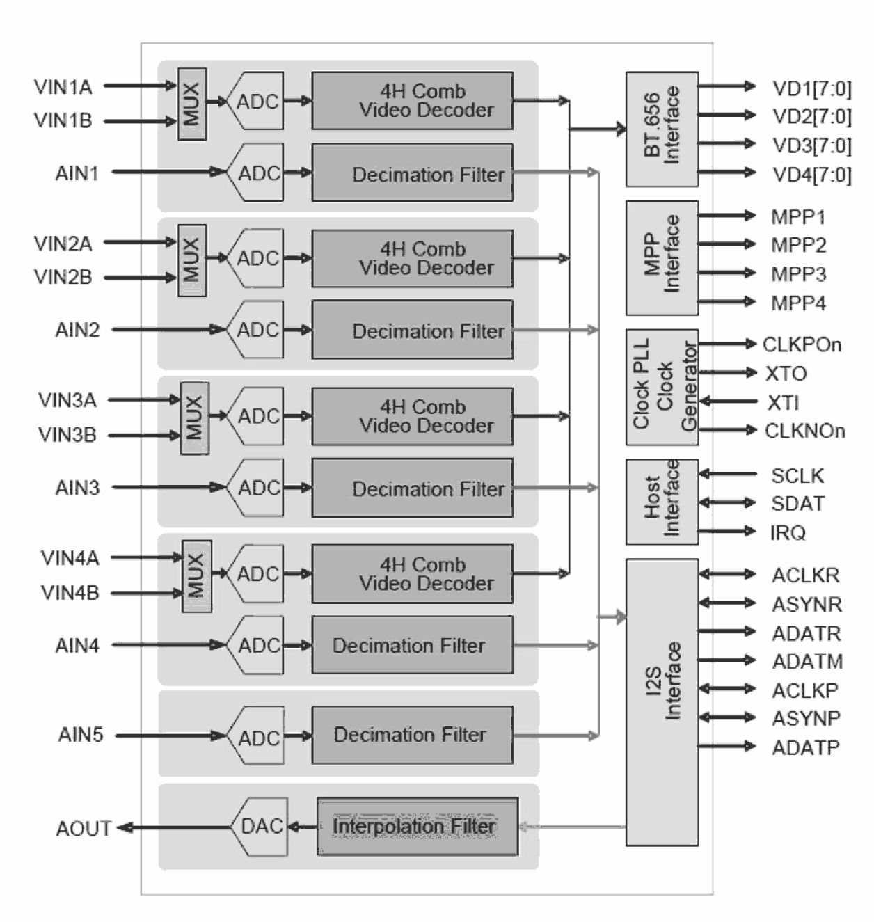 - Integrated four video analog anti-aliasing filters and 10-bit CMOS ADCs