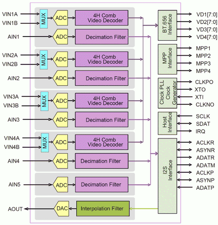• Software selectable analog inputs allows any of 2 CVBS per one video ADC