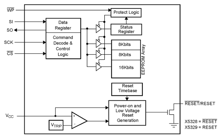 These devices combine three popular functions, Power-on Reset Control, Supply Voltage Supervision, and Block Lock Protect Serial EEPROM Memory in one package. This combination lowers system cost, reduces board space requirements, and increases reliability. Applying power to the device activates the power-on reset circuit which holds RESET/RESET active for a period of time. This allows the power supply and oscillator to stabilize before the processor can execute code. The Device's low VCC detection circuitry protects the user's system from low voltage conditions by holding RESET/RESET active when VCC falls below a minimum VCC trip point. RESET/RESET remains asserted until VCC returns to proper operating level and stabilizes. Five industry standard VTRIP thresholds are available, however, Intersil's unique circuits allow the threshold to be reprogrammed to meet custom requirements or to fine-tune the threshold in applications requiring higher precision.