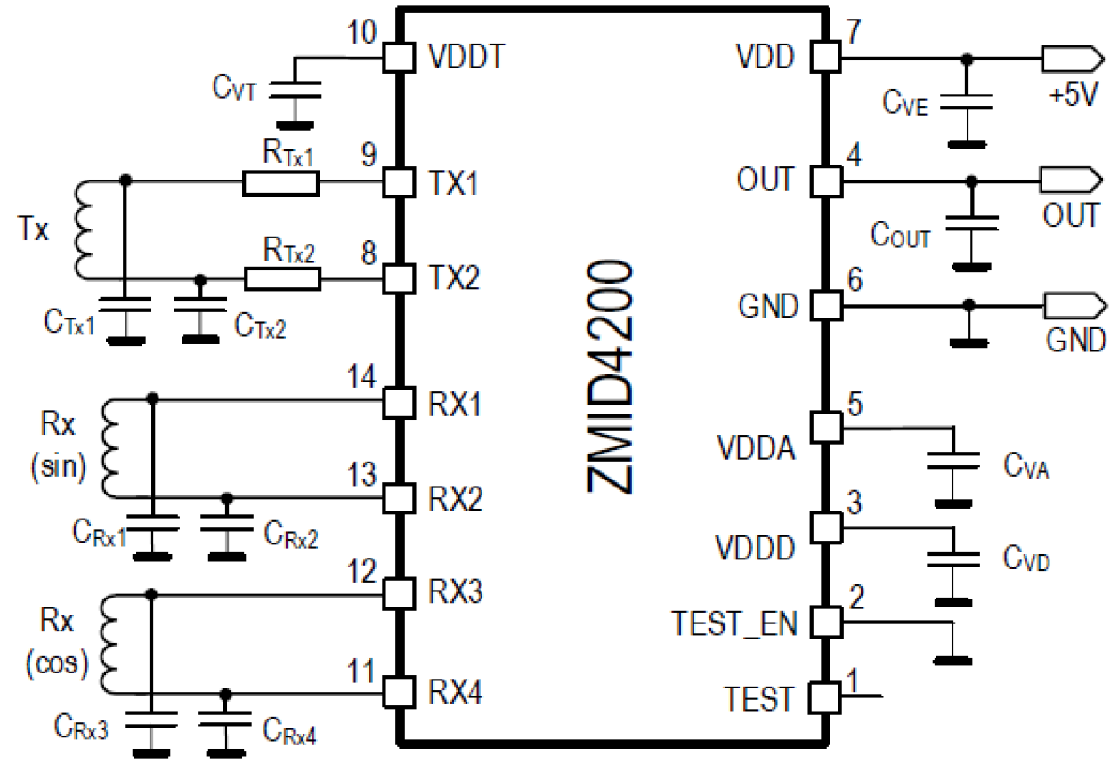 The ZMID4200 is an inductive position sensor IC with analog output, used for absolute rotary and linear motion sensing in industrial and consumer applications. The ZMID4200 uses the physical principles of induction in a wire loop and Eddy currents to detect the position of a metallic target that is sliding or rotating above a set of coils, consisting of one transmitter coil and two receiver coils. The three coils are typically printed as copper traces on a printed circuit board (PCB). They are arranged such that the transmitter coil induces a secondary voltage in the receiver coils which depends on the position of the metallic target above the coils. After demodulating and processing the secondary voltages from the receiver coils, a signal representative of the metallic target’s position over the coils is obtained. The ZMID4200 is qualified to function up to 150 °C of ambient temperature.