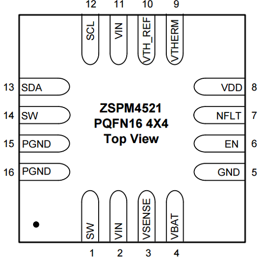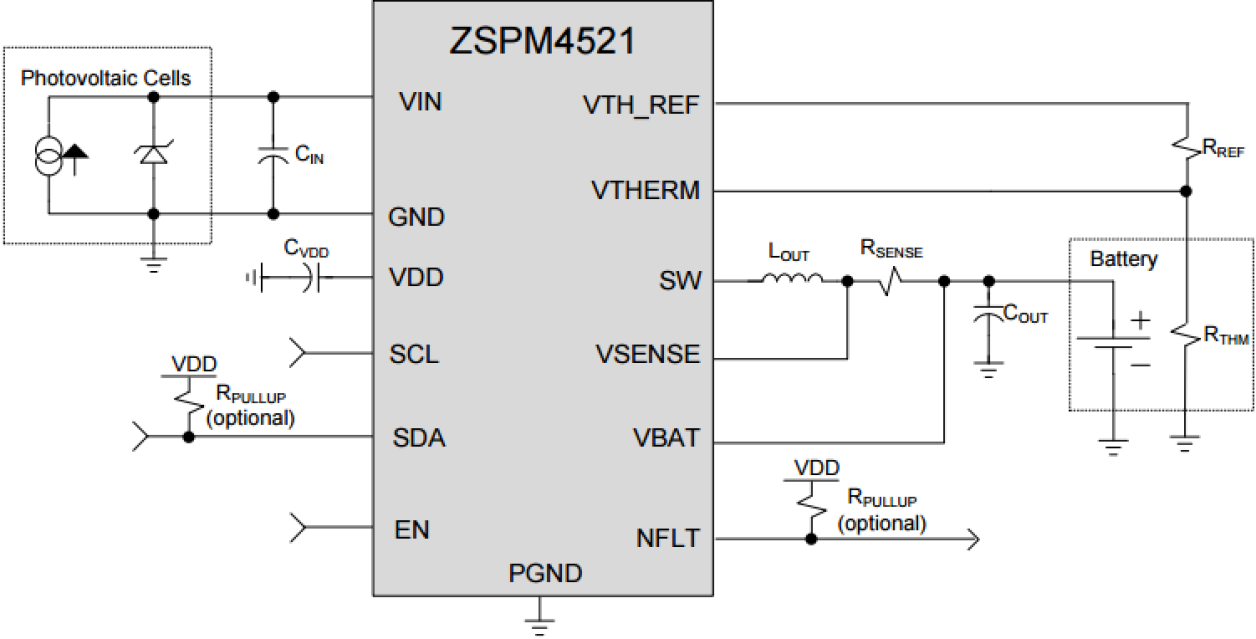 The ZSPM4521 is a DC/DC synchronous switching lithium-ion (Li-Ion) battery charger with fully integrated power switches, internal compensation, and full fault protection. It uses a temperature-independent photovoltaic maximum power point tracking (MPPT) function to optimize power output from the source during Full-Charge Constant-Current (CC) Mode. Its switching frequency of 1MHz enables the use of small filter components, resulting in smaller board space and reduced bill-of material costs. During Full-Charge Constant-Current Mode, the duty cycle is controlled by the MPPT regulator. Once the battery’s termination voltage is reached, the regulator operates in Constant Voltage Mode. In this mode, the ZSPM4521 modulates the charging current until the battery reaches full charge. When the regulator is disabled (the EN pin is low), the device draws 10µA (typical) quiescent current (Disabled Mode). The ZSPM4521 includes supervisory reporting through the NFLT (inverted fault) open-drain output to interface other components in the system. Device programming is achieved by an I²C interface through the SCL and SDA pins.