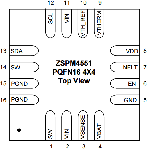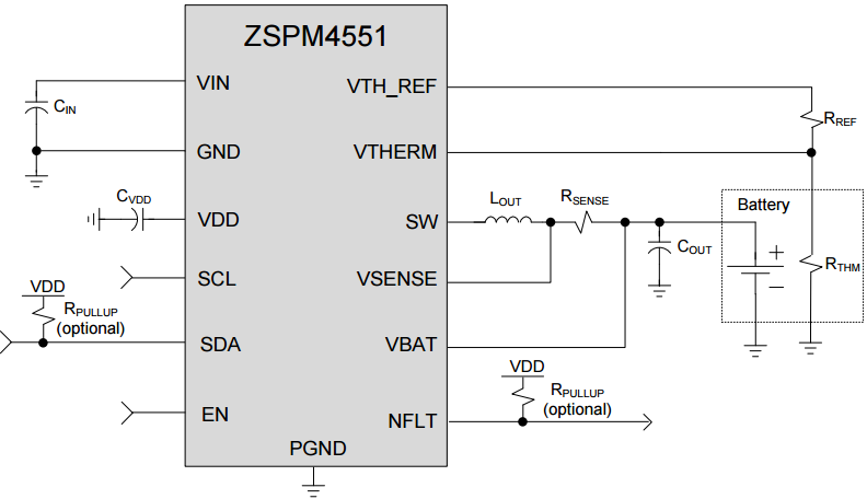 The ZSPM4551 is a DC/DC synchronous switching lithium-ion (Li-Ion) battery charger with fully integrated power switches, internal compensation, and full fault protection. Its switching frequency of 1MHz enables the use of small filter components, resulting in smaller board space and reduced BOM cost. In Full-Charge Constant-Current Mode, the regulation is for constant current (CC). Once termination voltage is reached, the regulator operates in voltage mode. When the regulator is disabled (the EN pin is low), the device draws 10µA (typical) quiescent current. The ZSPM4551 includes supervisory reporting through the NFLT (inverted fault) open-drain output to interface other components in the system. Device programming is achieved by an I²C interface through the SCL and SDA pins.