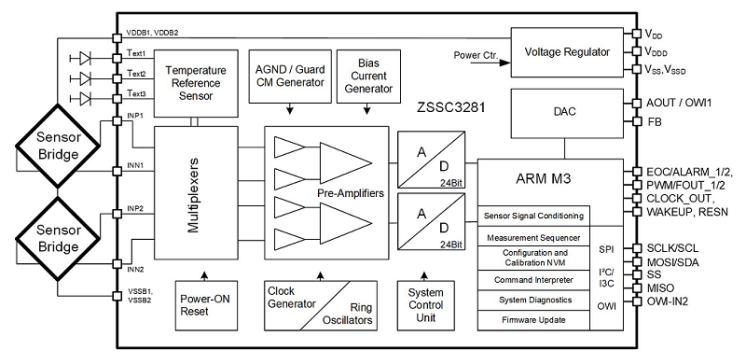 The ZSSC3281 provides measurement value readouts and programming capabilities via an I2C, SPI, or one-wire interface (OWI). Absolute and ratiometric voltage, current-loop, or interrupt outputs are supported by the ZSSC3281.