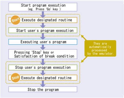 This emulator has the START/STOP function so that it is available to execute the designated routine of the user's program, immediately before starting the user's program execution or immediately after stopping the execution. Therefore you can interrupt the function you would like to halt during debugging and also resume it.