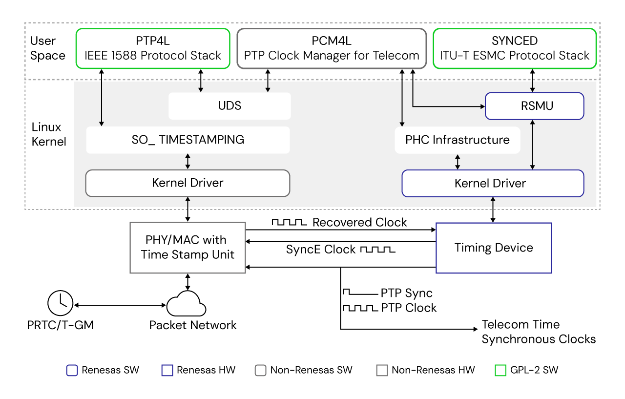 基于 Linux Kernel,PTP 时钟管理软件和 ClockMatrix 时钟器件的强大组合,客户可以非常容易地将瑞萨方案和任意供应商的 TSU 融合设计,并在电信以及非电信场景中应用。 很多 TSU 供应商均提供基于 Linux 内核的驱动程序,用于创建即插即用开发环境。