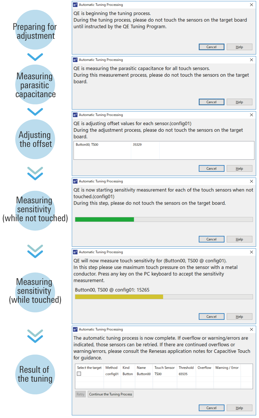 This tool enables automatic tuning for the sensitivity of the capacitive touch sensors. You can complete basic tuning within a few minutes by following the instructions in the pop-up messages.