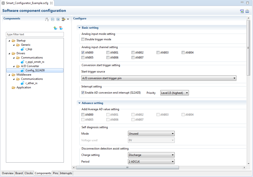 In the [Software component configuration] window, you can embed sample code and make settings for peripheral modules. After selecting the module you wish to set up for use, you can check for errors in settings (with some types indicated on the display) or switch the channels for use by drivers of multi-channel modules.