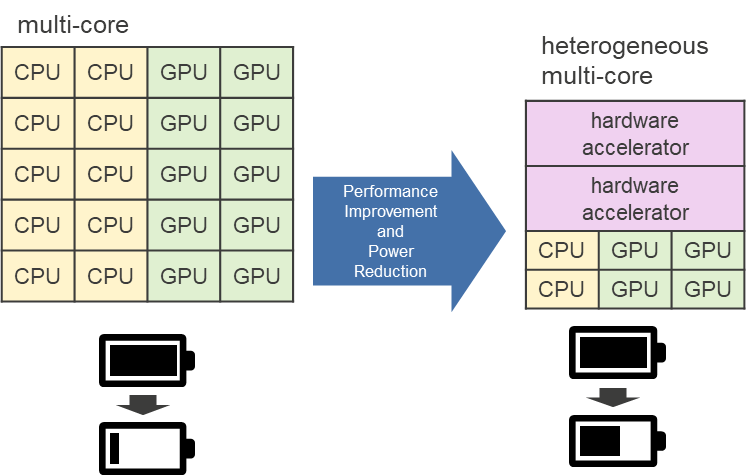另一方面,半导体器件正在进入后摩尔时代,与以往一样,我们需要通过功率、执行速度和半导体工艺满足逐年增加的庞大运算量需求。人们试图利用通用CPU和 GPU多核实现这点,却因其功耗巨大而不切实际。因此,这里需要一种异构AI设备,该设备具有多个专为应用程序而设计的专用硬件加速器。此外,我们需要掌握利用该设备的专用工具相关知识。